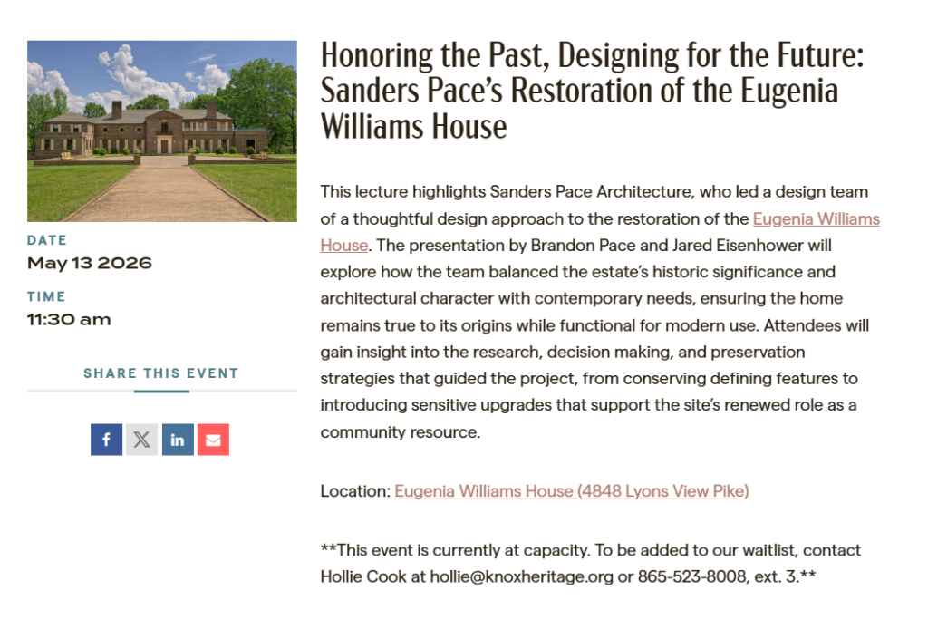 Jared Eisenhower and Brandon Pace present the design approach to the restoration of the Eugenia Williams House as part of Knox Heritage Lecture Series