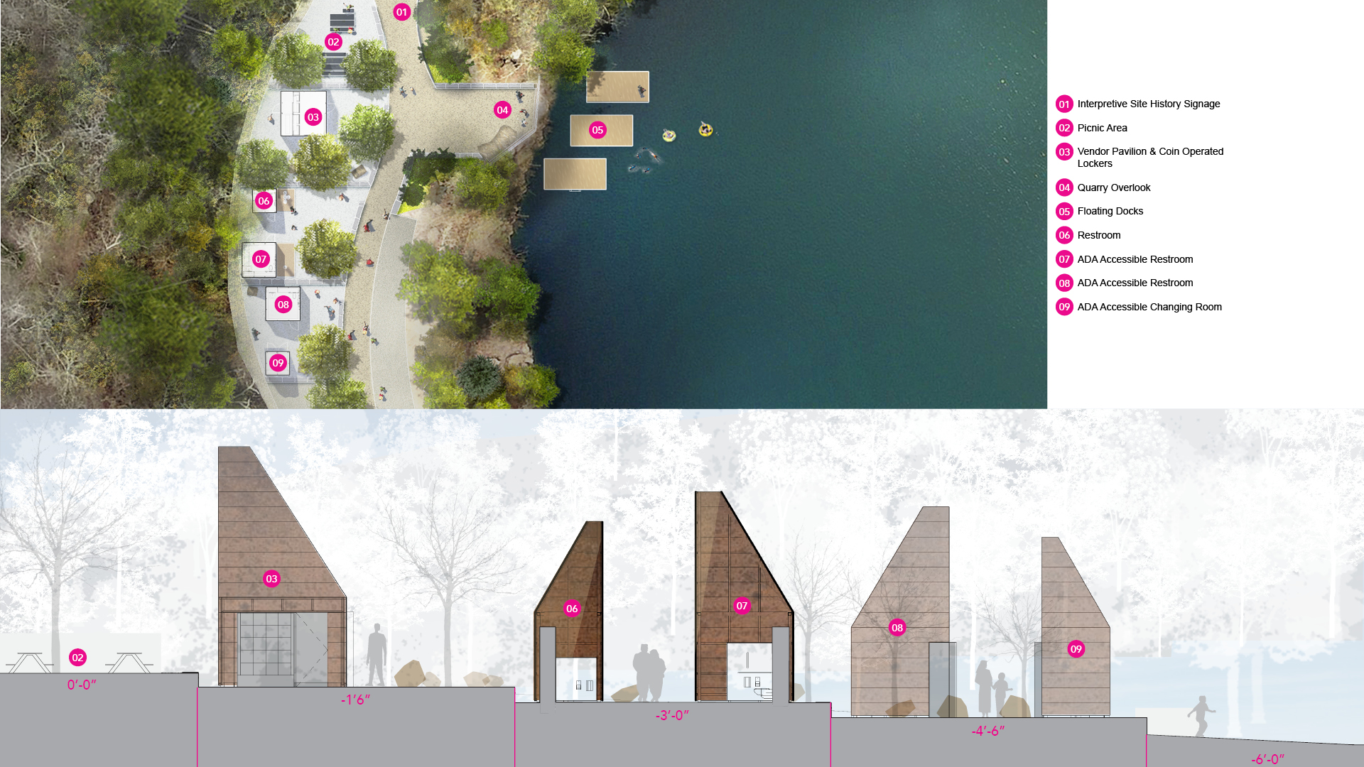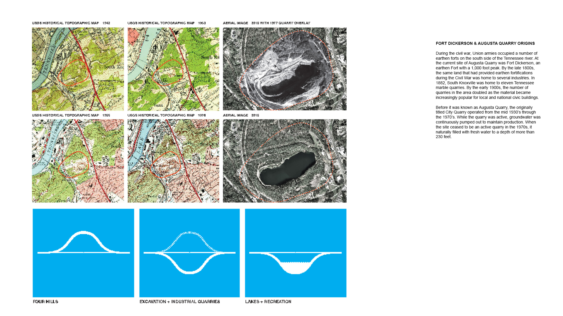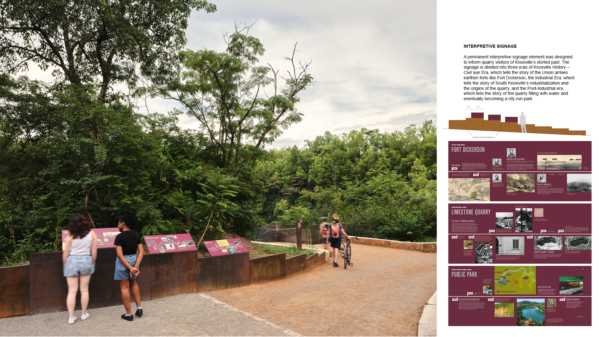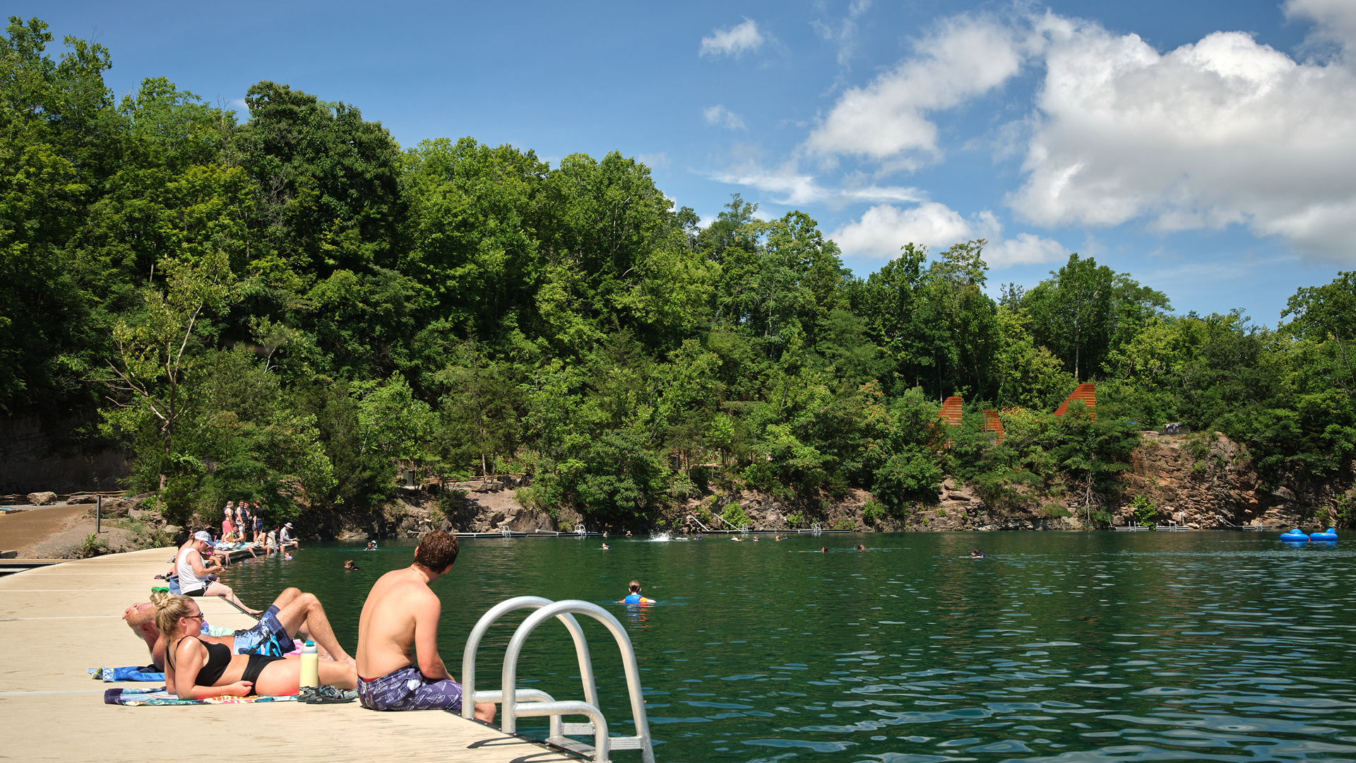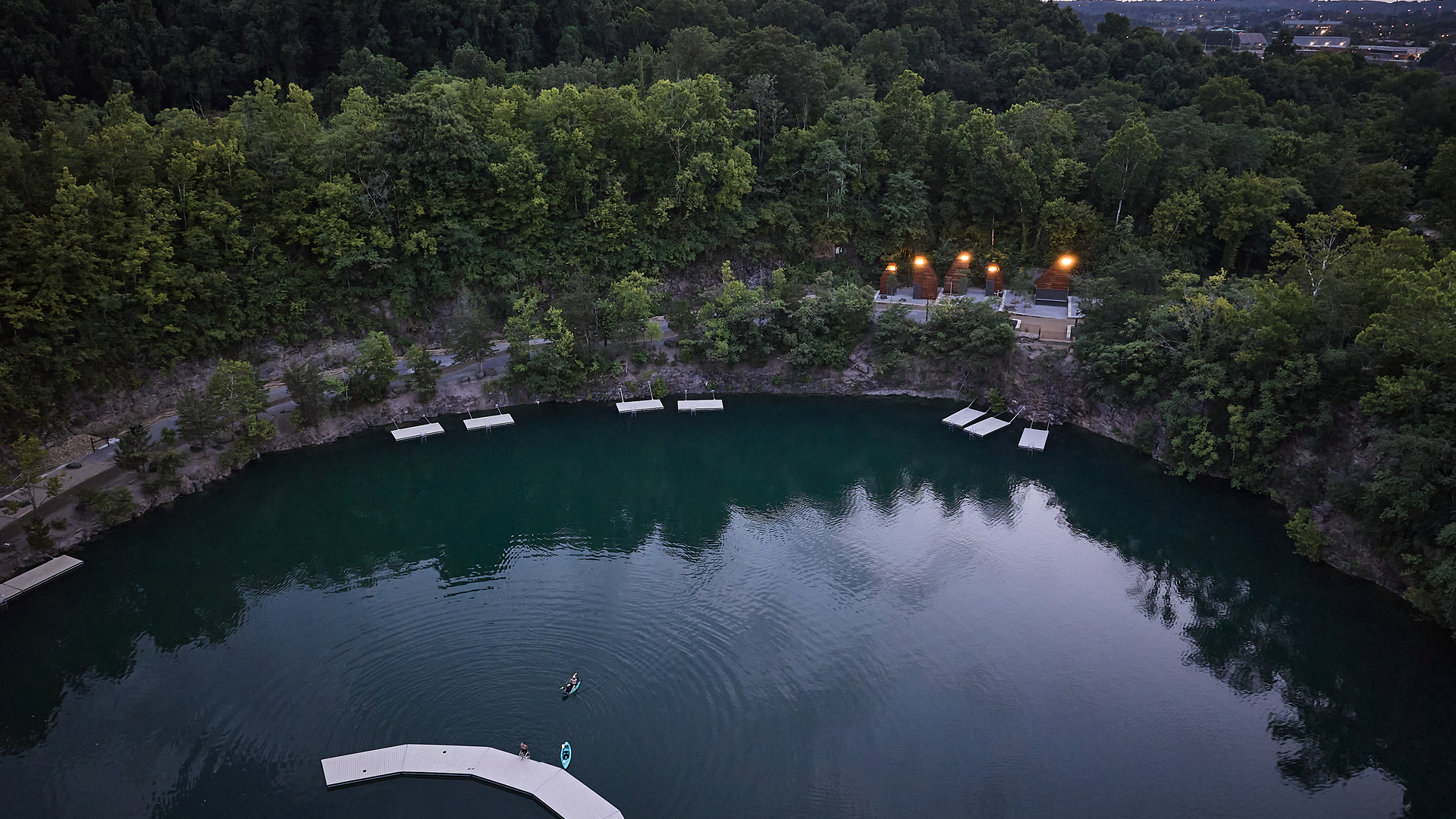 In 2016 a multi-disciplinary team led by Sanders Pace Architecture was commissioned to create a comprehensive framework for the future development of a collection of significant cultural and historical sites located just two miles from downtown Knoxville. Working closely with the City of Knoxville, the team proposed Battlefield Loop, a network of recreational assets expanding Knoxville’s “Urban Wilderness” to incorporate a number of industrial relics that are foundational to the city’s early role as a manufacturing leader in the post-civil war New South. As a catalyst project for Battlefield Loop, Augusta Quarry re-positions an abandoned industrial site at the base of historic Fort Dickerson as a public aquatic destination. The quarry, which was founded as the City Quarry in 1950 and then abandoned in the late 1970’s, is now a City-operated crystal-blue swimming hole and a civic staple for Knoxville’s hot summer months. The project program introduced recreational amenities to the park including a vendor kiosk, restrooms and a series of intimate changing rooms near the quarry’s entry. New site circulation includes paths that connect the amenity structures to quarry overlooks and a network of floating docks that host and animate various scales of gathering, recreation and leisure. Architecture and Landscape design are grounded in sustainable strategies that engage the site and visitors through a light touch, allowing the natural beauty of the quarry and civic life to remain a primary focus.