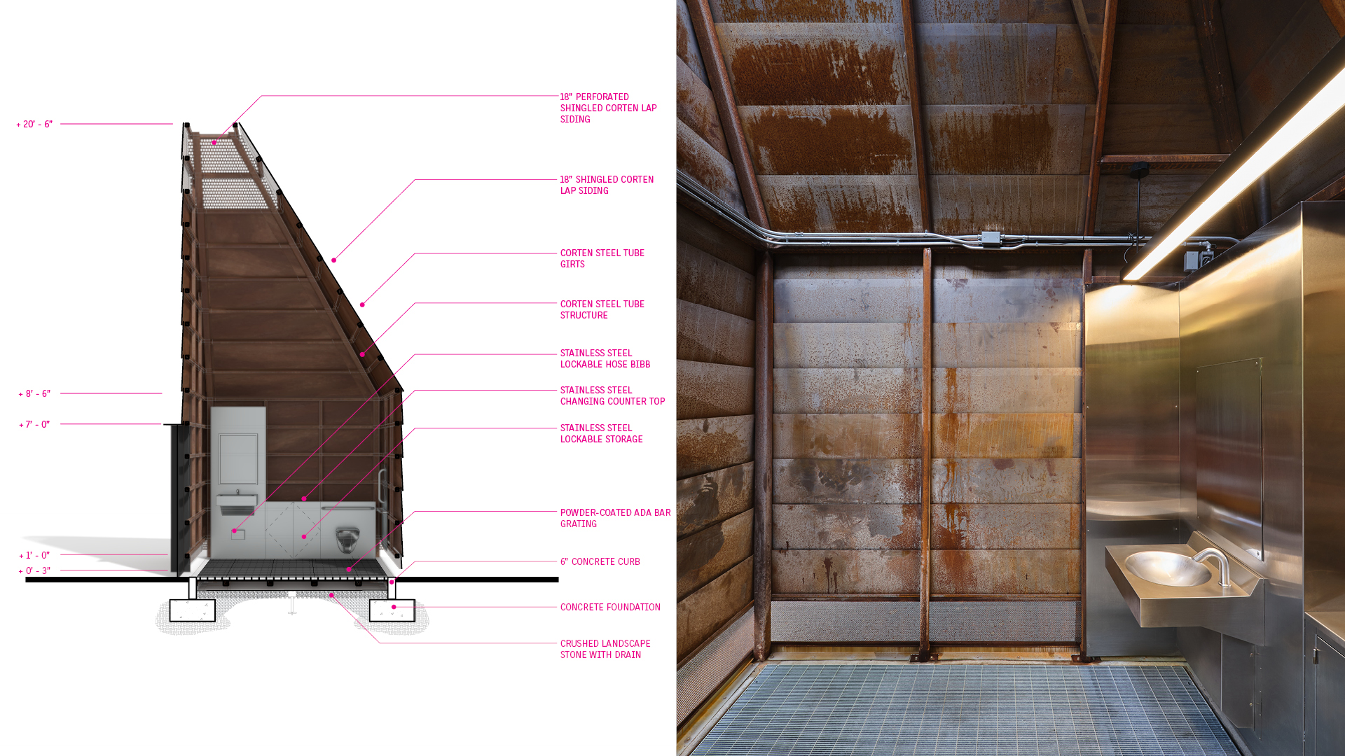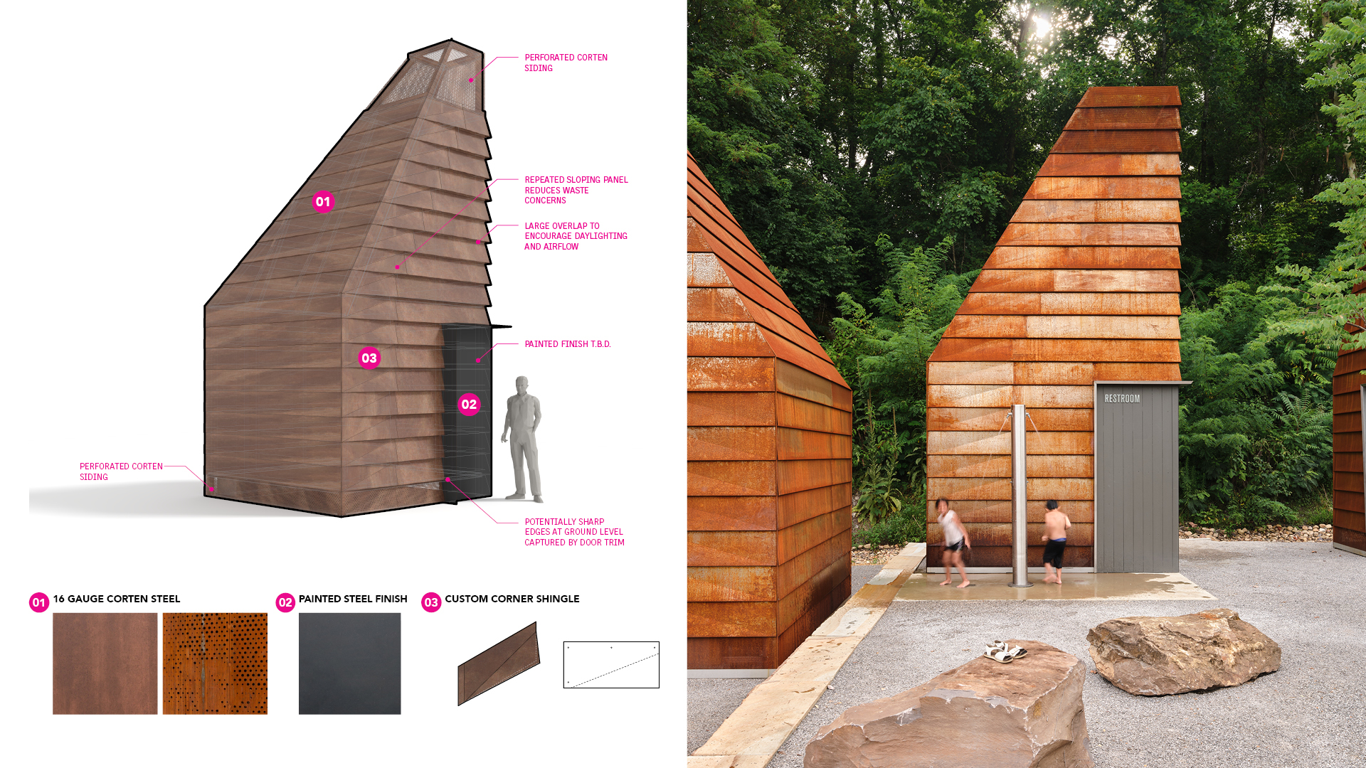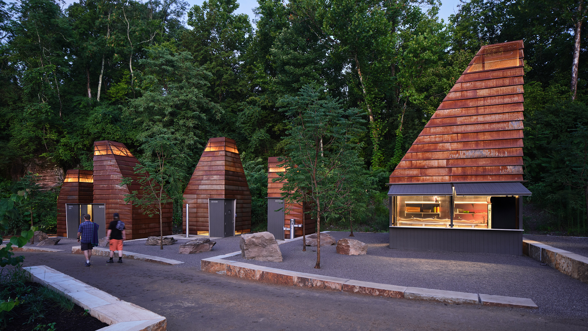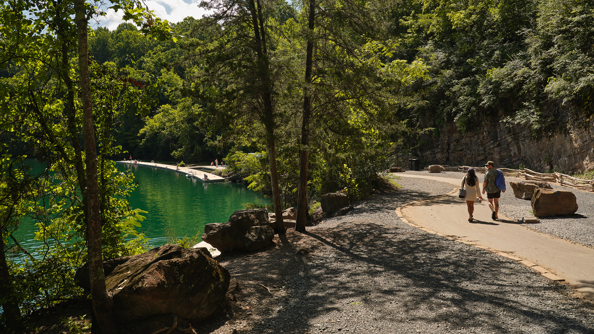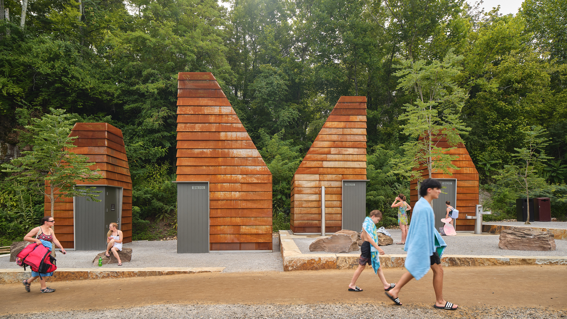 In 2016 a multi-disciplinary team led by Sanders Pace Architecture was commissioned to create a comprehensive framework for the future development of a collection of significant cultural and historical sites located just two miles from downtown Knoxville. Working closely with the City of Knoxville, the team proposed Battlefield Loop, a network of recreational assets expanding Knoxville’s “Urban Wilderness” to incorporate a number of industrial relics that are foundational to the city’s early role as a manufacturing leader in the post-civil war New South. As a catalyst project for Battlefield Loop, Augusta Quarry re-positions an abandoned industrial site at the base of historic Fort Dickerson as a public aquatic destination. The quarry, which was founded as the City Quarry in 1950 and then abandoned in the late 1970’s, is now a City-operated crystal-blue swimming hole and a civic staple for Knoxville’s hot summer months. The project program introduced recreational amenities to the park including a vendor kiosk, restrooms and a series of intimate changing rooms near the quarry’s entry. New site circulation includes paths that connect the amenity structures to quarry overlooks and a network of floating docks that host and animate various scales of gathering, recreation and leisure. Architecture and Landscape design are grounded in sustainable strategies that engage the site and visitors through a light touch, allowing the natural beauty of the quarry and civic life to remain a primary focus.