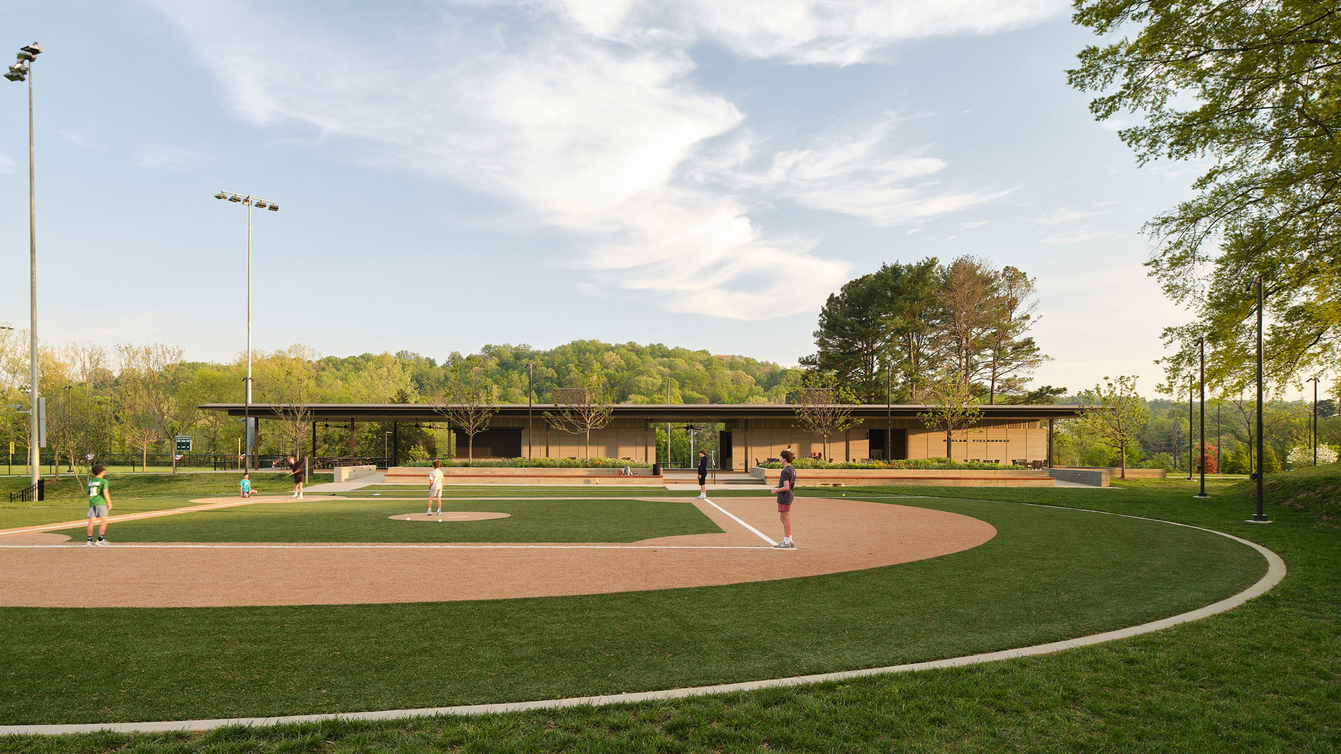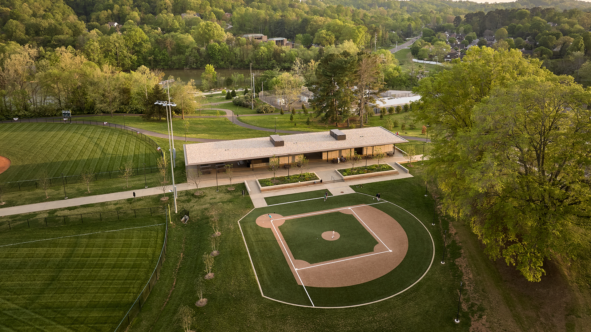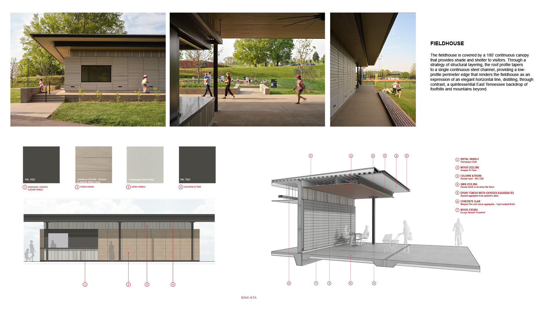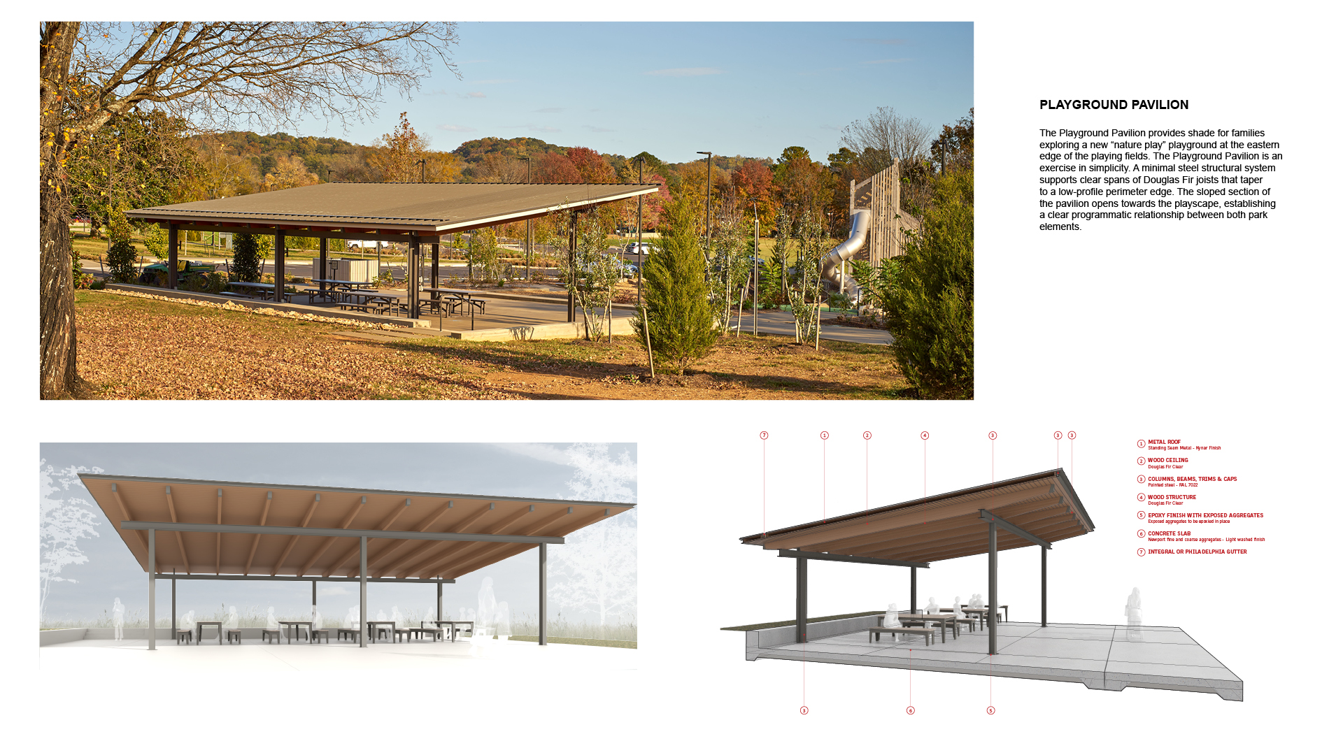 Lakeshore Park is a 185-acre park located along the Tennessee River with expansive views of the Tennessee River and the Great Smoky Mountains. Formerly the site of a state-owned mental health institute, the land was acquired by Lakeshore Park Conservancy and repurposed as a public park in 1996. After an updated Landscape Masterplan was developed, Sanders Pace Architecture was selected to join a team led by Nelson Byrd Woltz to provide design services for three new park pavilion structures: a new Fieldhouse adjacent to a variety of playing fields; a new Garden Pavilion adjacent to a collection of park gardens; and a Playground Pavilion adjacent to a new nature playscape. Individually, the pavilions each serve as a recreational hub and provide support functions for adjacent park programming and activities. Taken together, the family of pavilions introduce a dignified and aspirational civic vocabulary, establishing a vital placemaking strategy that is core to the identity of the park itself.