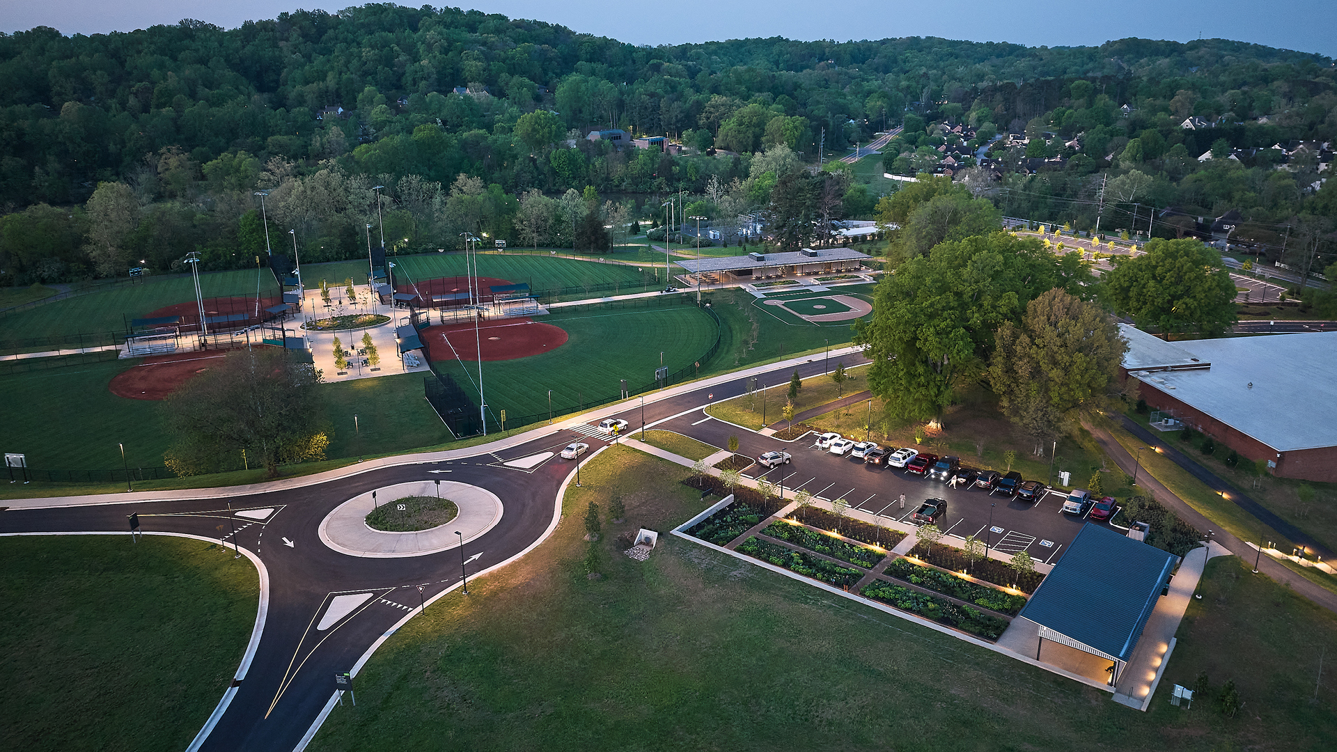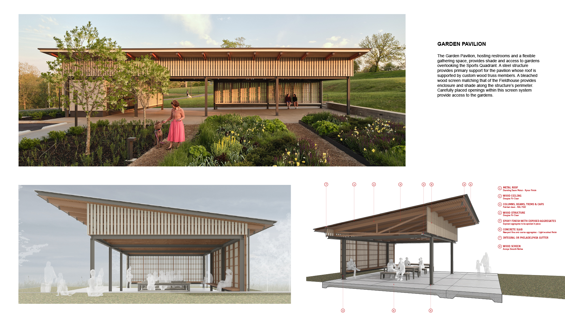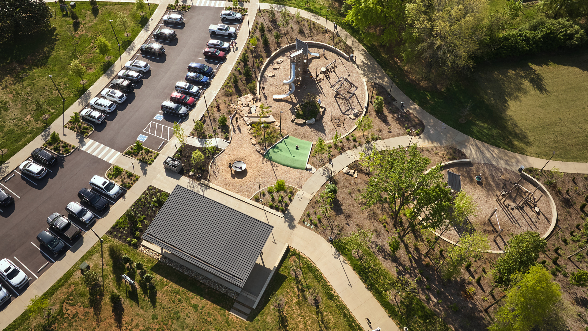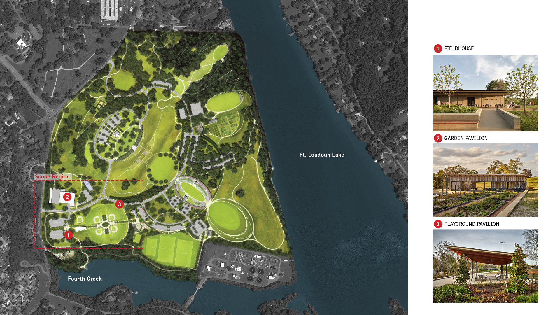 Lakeshore Park is a 185-acre park located along the Tennessee River with expansive views of the Tennessee River and the Great Smoky Mountains. Formerly the site of a state-owned mental health institute, the land was acquired by Lakeshore Park Conservancy and repurposed as a public park in 1996. After an updated Landscape Masterplan was developed, Sanders Pace Architecture was selected to join a team led by Nelson Byrd Woltz to provide design services for three new park pavilion structures: a new Fieldhouse adjacent to a variety of playing fields; a new Garden Pavilion adjacent to a collection of park gardens; and a Playground Pavilion adjacent to a new nature playscape. Individually, the pavilions each serve as a recreational hub and provide support functions for adjacent park programming and activities. Taken together, the family of pavilions introduce a dignified and aspirational civic vocabulary, establishing a vital placemaking strategy that is core to the identity of the park itself.